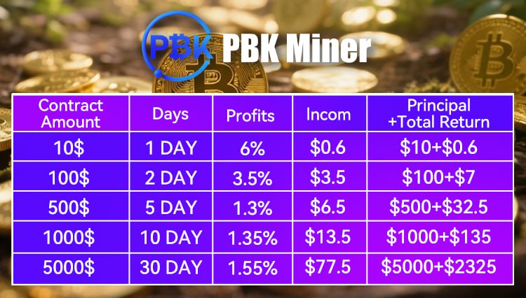 Atualmente, a PBK Miner oferece várias opções de contratos de mineração, como contratos de US$ 100, US$ 500 e US$ 1.000, cada um com retorno sobre investimento (ROI) e período contratual diferentes.