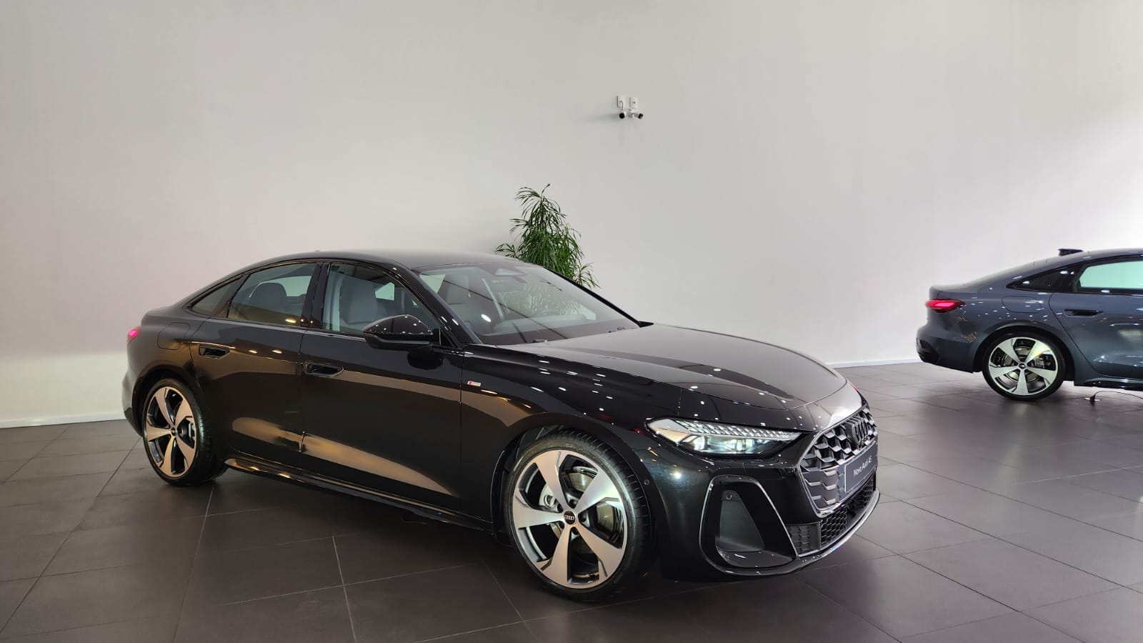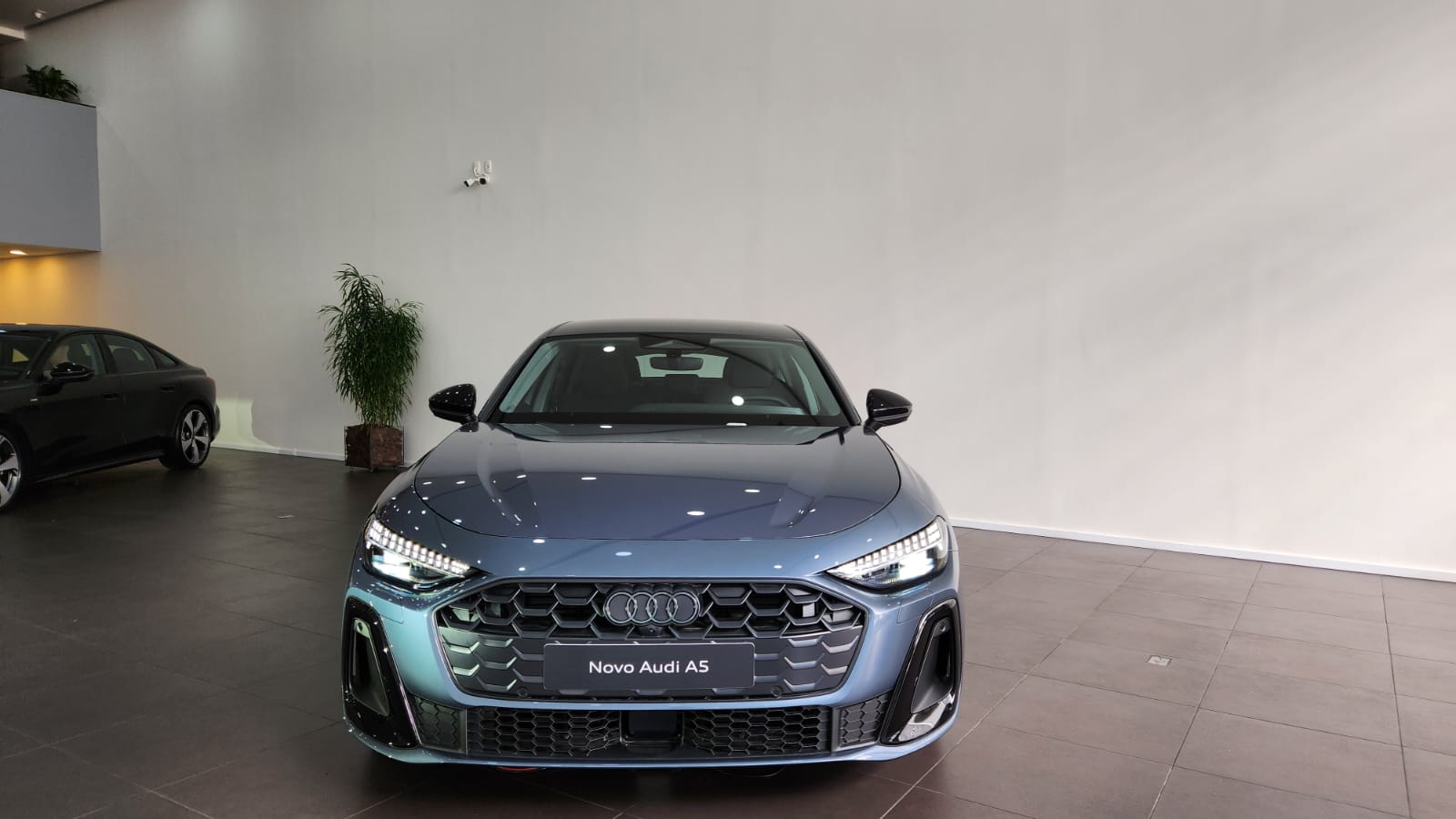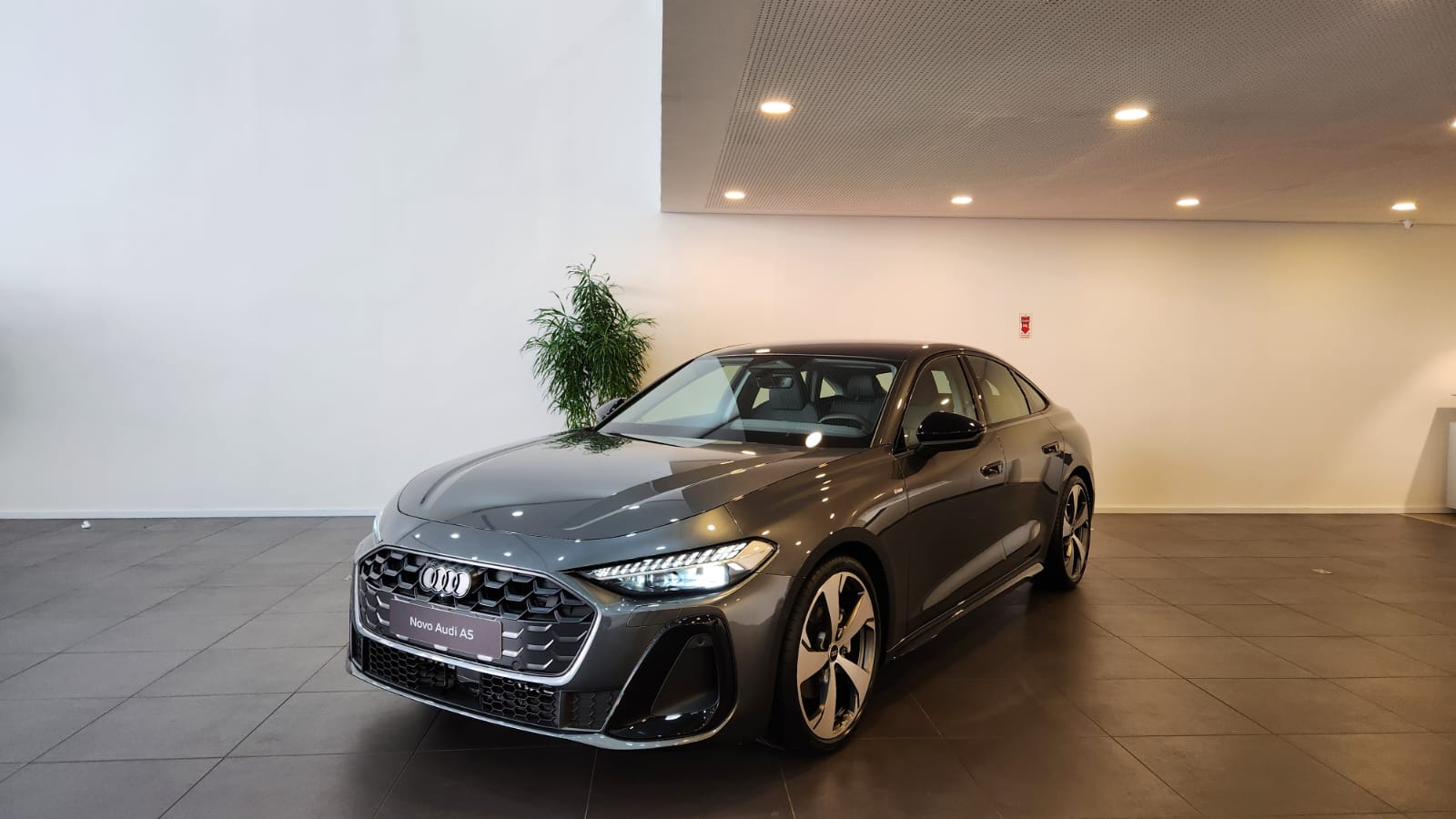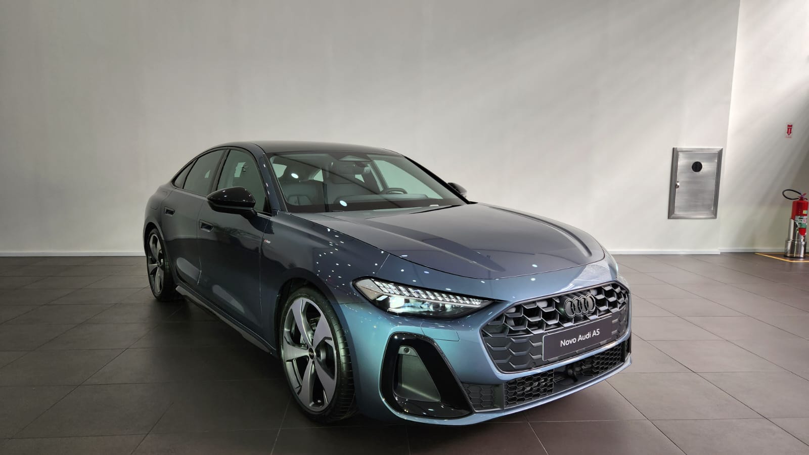 Visualmente, o A5 segue a nova estética da marca: superfícies limpas, vincos suaves e perfil escultural. A dianteira possui faróis redesenhados e grade singleframe com padrão favo de mel tridimensional. As rodas Audi Sport de 20 polegadas acompanham pneus 245/35, com cinco braços Falx e acabamento em cinza acetinado fosco.
