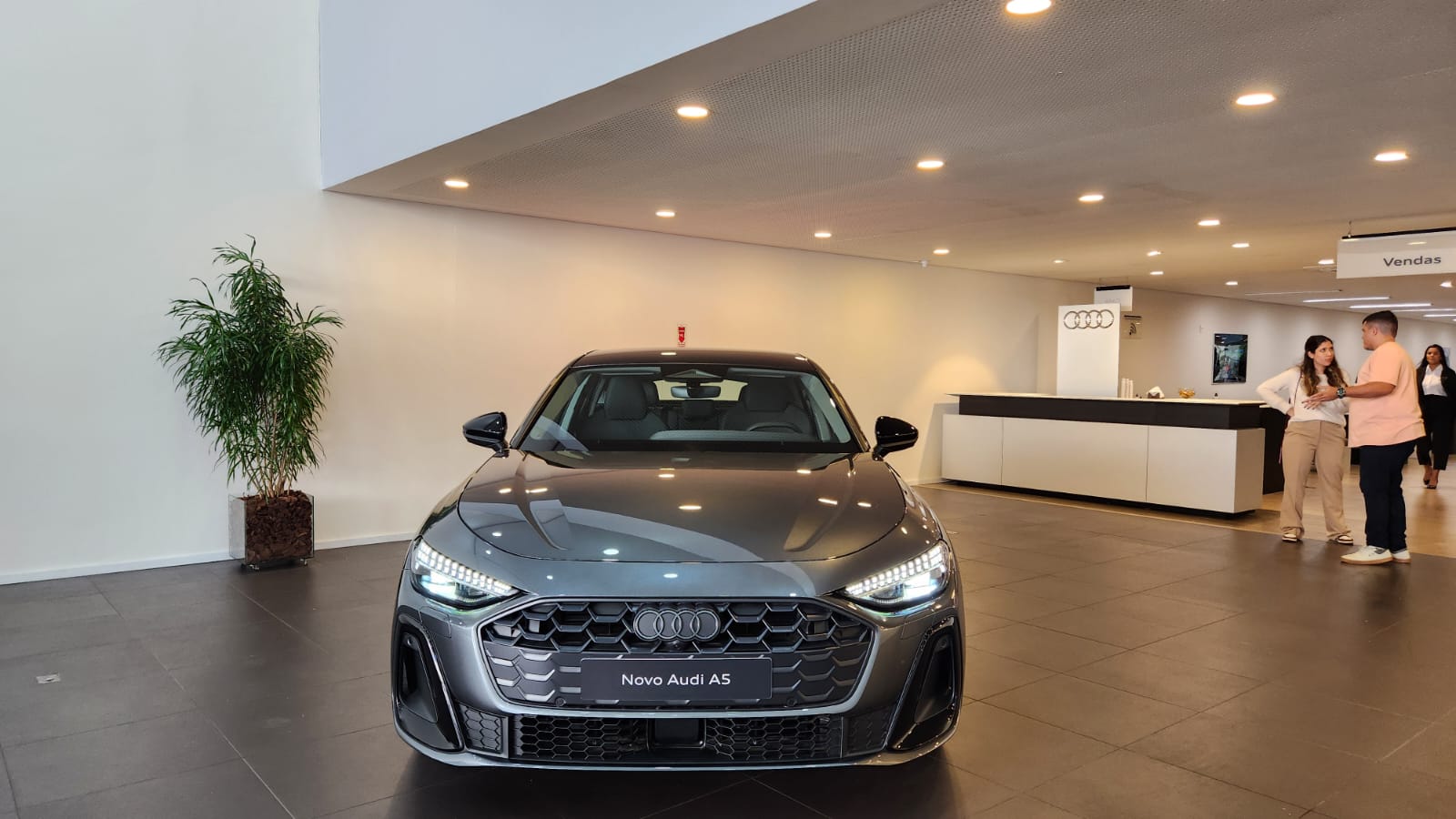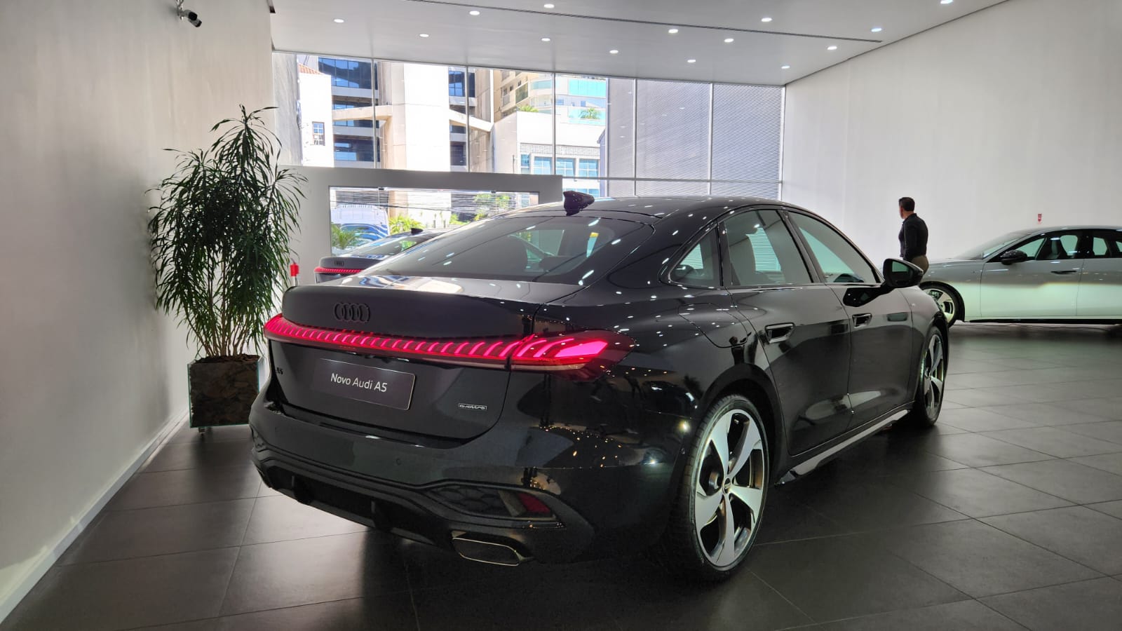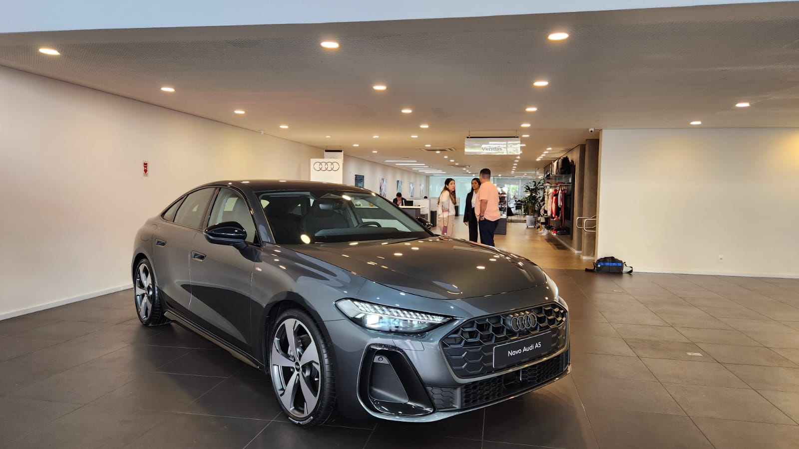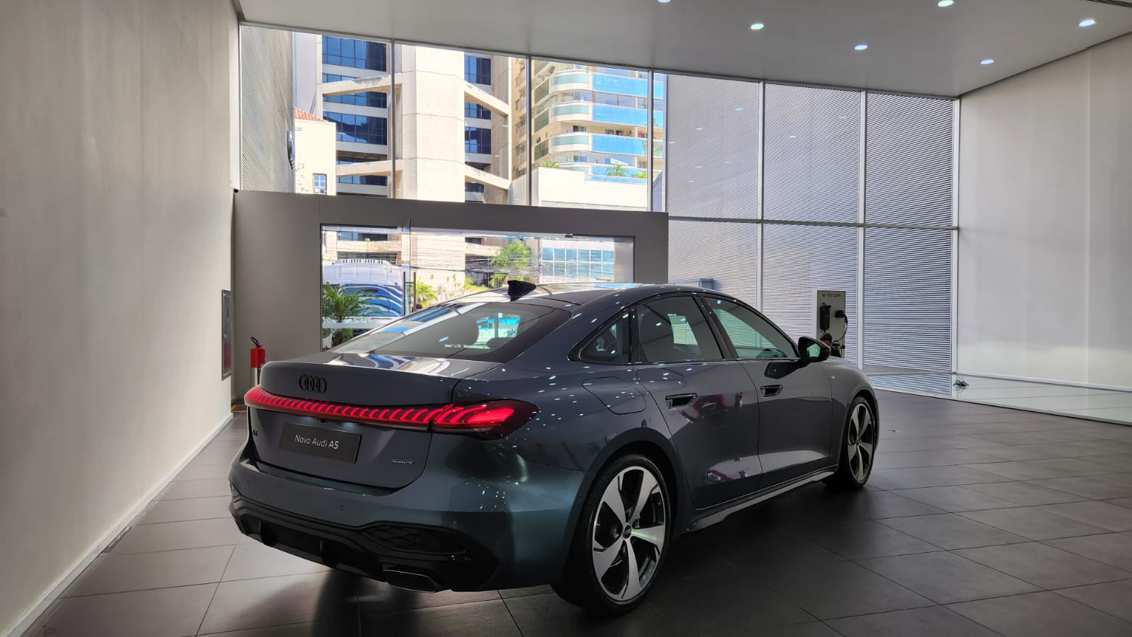 Visualmente, o A5 segue a nova estética da marca: superfícies limpas, vincos suaves e perfil escultural. A dianteira possui faróis redesenhados e grade singleframe com padrão favo de mel tridimensional. As rodas Audi Sport de 20 polegadas acompanham pneus 245/35, com cinco braços Falx e acabamento em cinza acetinado fosco.