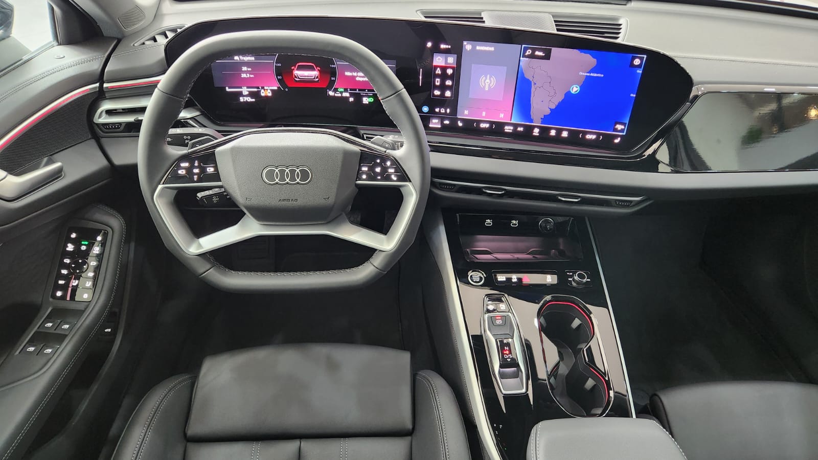 Segundo a Audi, o foco do projeto interior é centrado no ocupante. O painel digital é dividido entre o Audi Virtual Cockpit de 11,9 polegadas e o display panorâmico curvo com tecnologia OLED de 14,5 polegadas. Os comandos são integrados ao novo conceito operacional da marca, enquanto o sistema de luz ambiente oferece 30 opções de cores configuráveis.