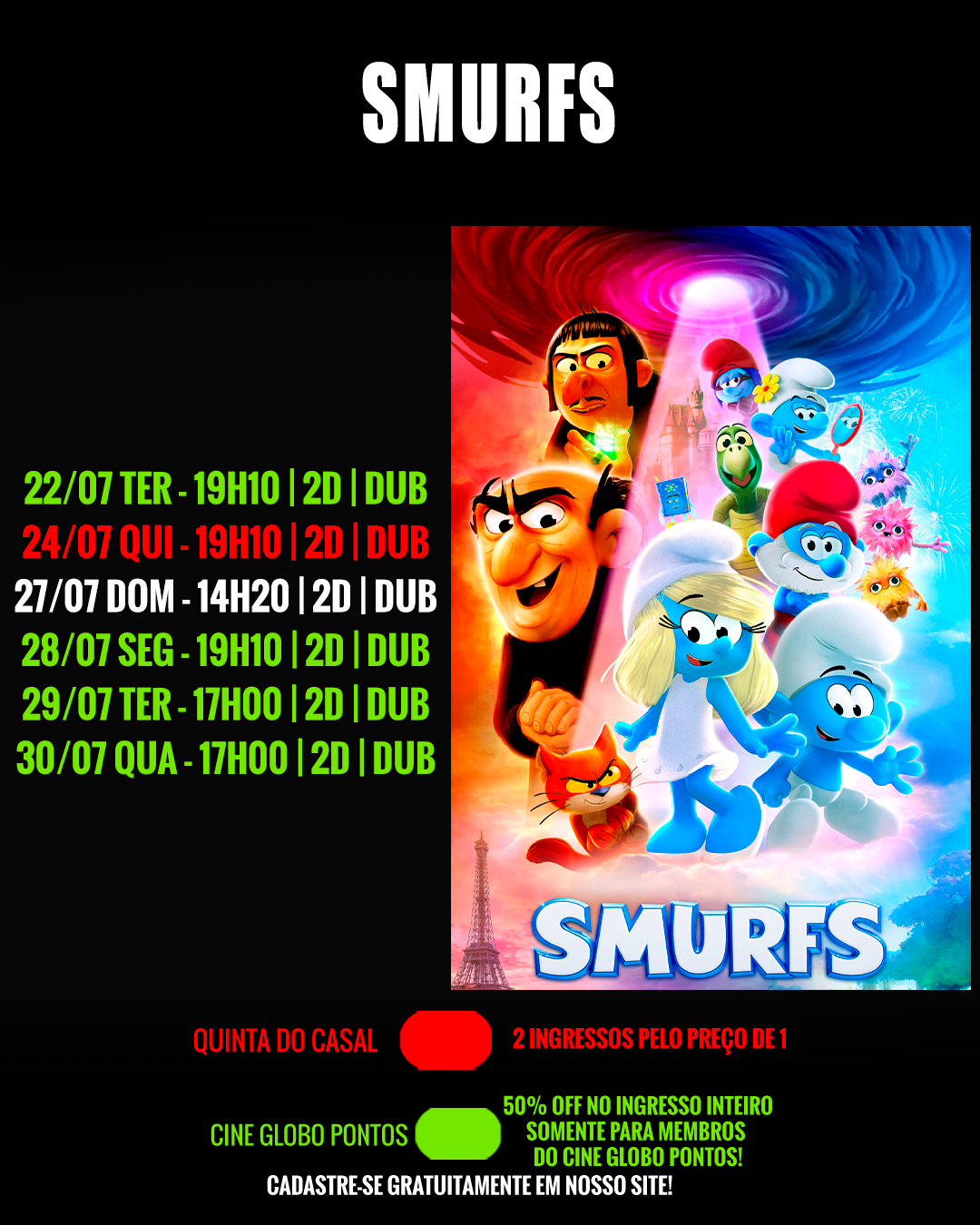 DIAS 22, 23, 28, 29 E 30/07 - 50% DE DESCONTO NO INGRESSO INTEIRO PARA MEMBROS DO CINE GLOBO PONTOS! SE INSCREVA GRATUITAMENTE EM NOSSO APP