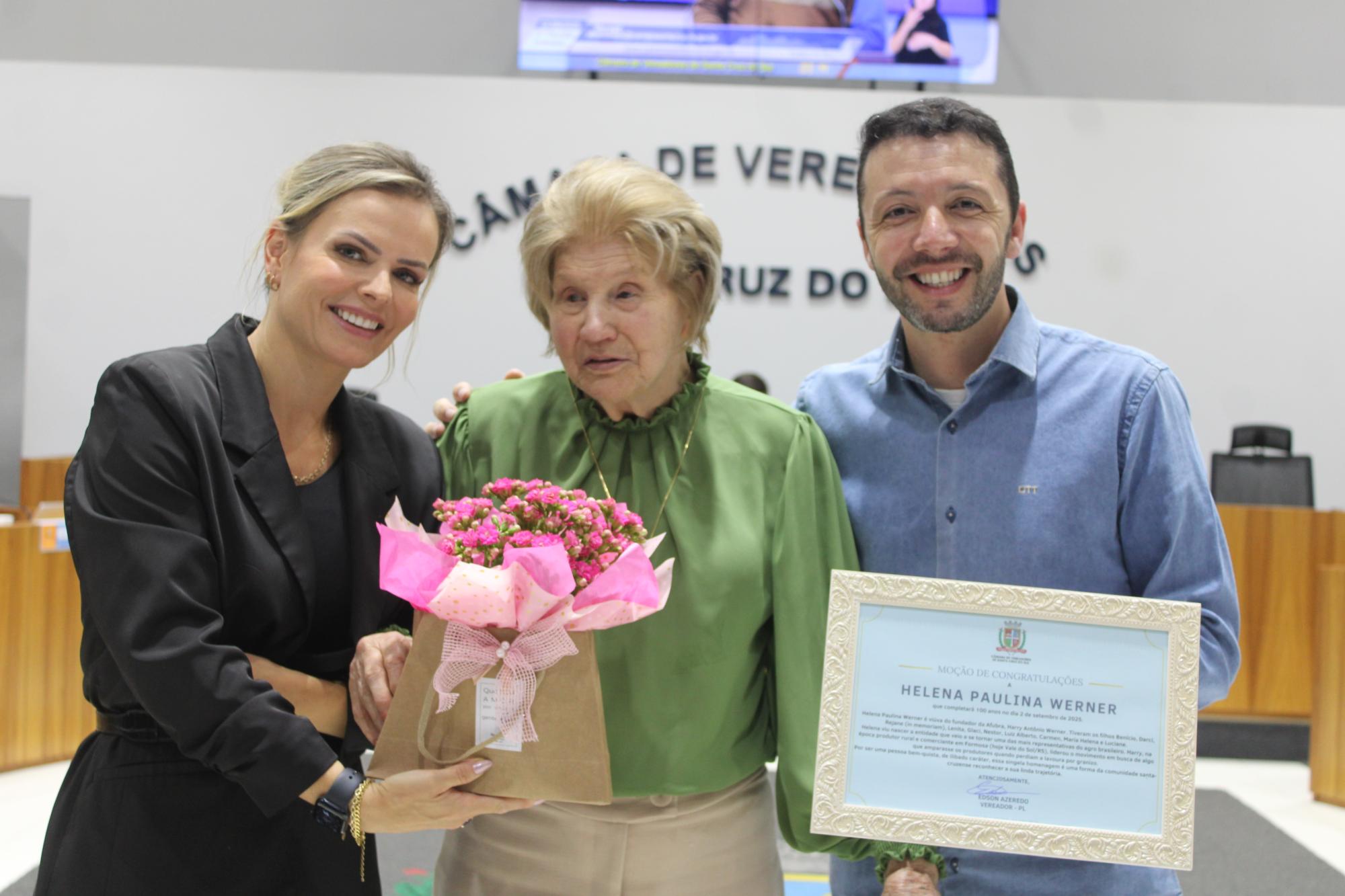 Santa Cruz do Sul – O vereador Edson Azeredo (PL) entregou na sessão desta segunda-feira, dia 1º, uma moção de congratulações à Helena Paulina Werner, que completa 100 anos neste dia 2. Helena é viúva do fundador da Associação dos Fundadores do Brasil (Afubra), Harry Antônio Werner. O casal teve os filhos Benício, Darci, Rejane (in memoriam), Lenita, Glaci, Nestor, Luiz Alberto, Carmen, Maria Helena e Luciane. A família esteve presente, acompanhando a sessão do Legislativo.