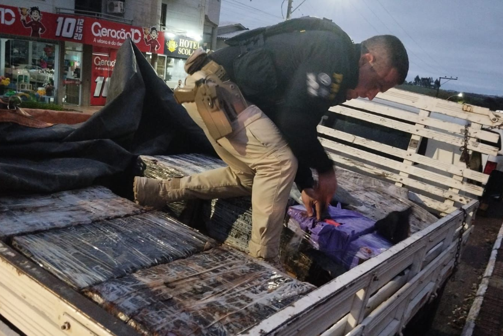 Foram realizadas buscas na cidade e a caminhonete, emplacada em Tijucas/SC, foi encontrada estacionada em via pública em frente a uma praça. Ao olhar embaixo da lona que cobria a carga, os PRFs encontraram centenas de tabletes de maconha.