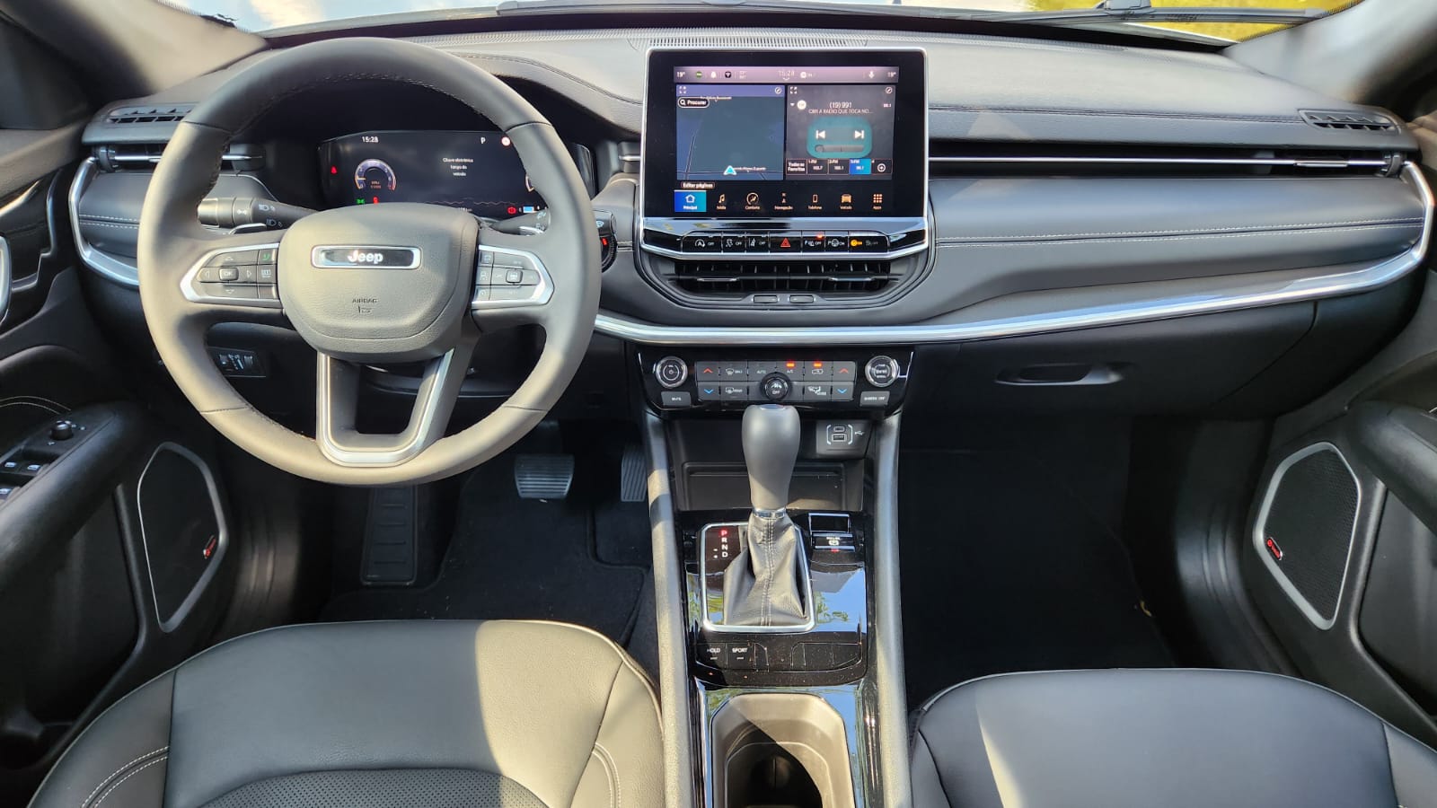 A linha Compass 2026 é formada pelas versões Sport T270, Longitude T270, Série S T270 e Blackhawk. A Sport inclui novos recursos de personalização, como os pacotes Exclusive, Tech e Premium, oferecendo itens como bancos de couro, painel digital, teto solar e condução semiautônoma. A Longitude amplia a oferta de conectividade com central multimídia compatível com espelhamento sem fio e GPS integrado. A Série S, que foi a versão que avaliei, reúne equipamentos que priorizam conveniência, como bancos elétricos dianteiros, porta-malas com abertura por sensor, teto panorâmico, rodas de 19 polegadas e recursos de assistência como monitoramento de ponto cego e Park Assist. Já a Blackhawk, equipada com o motor Hurricane 2.0, tração 4x4 e seletores de terreno, ocupa o topo da linha com foco em desempenho e capacidade.