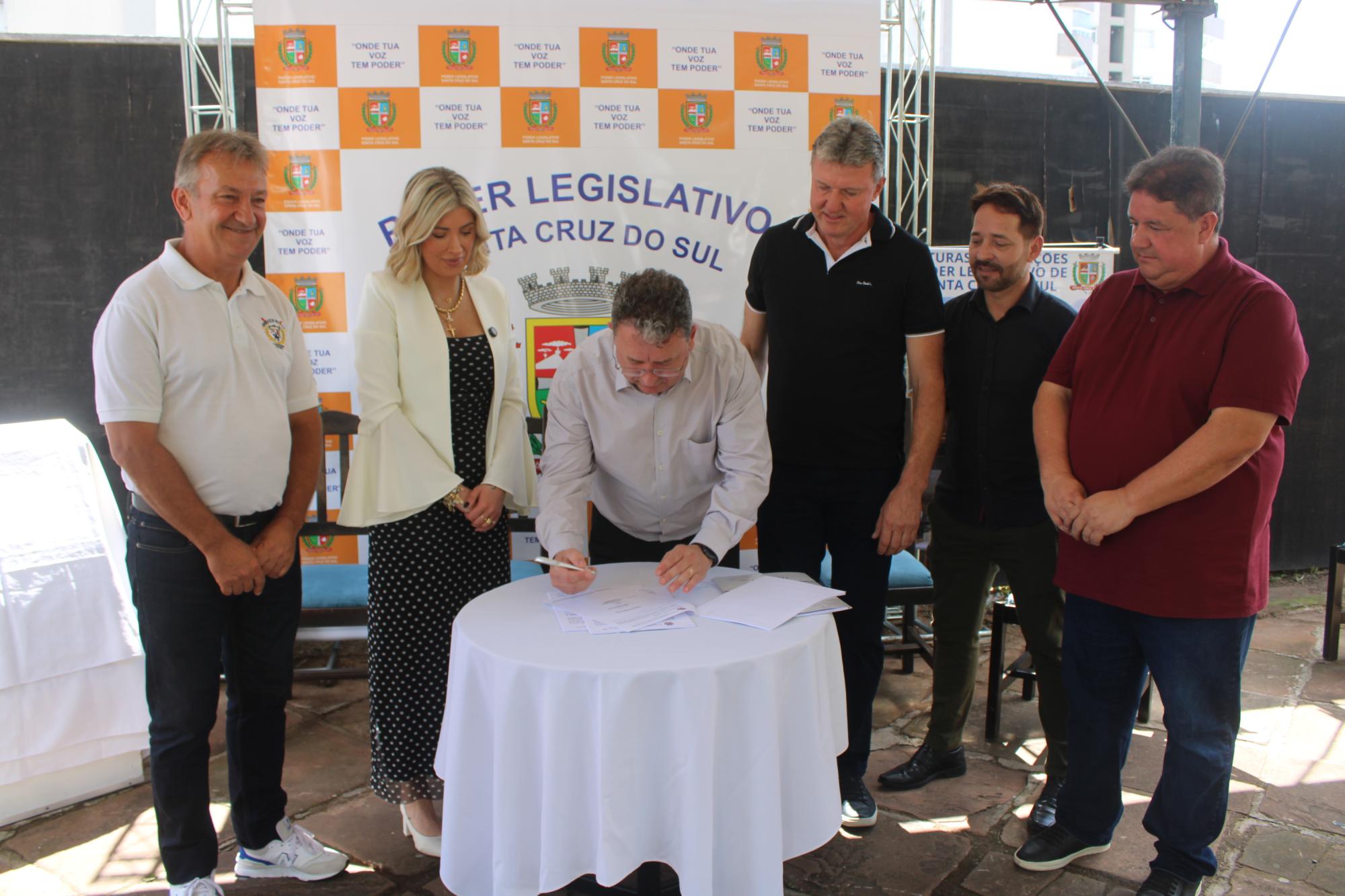 O ato de assinatura foi realizado na calçada do terreno do futuro prédio, com a presença dos representantes da empresa, de vereadores e funcionários da Câmara. A presidente Nicole disse que trata-se de um momento histórico para o município, pois é mais um passo para a construção da sede própria do Legislativo.