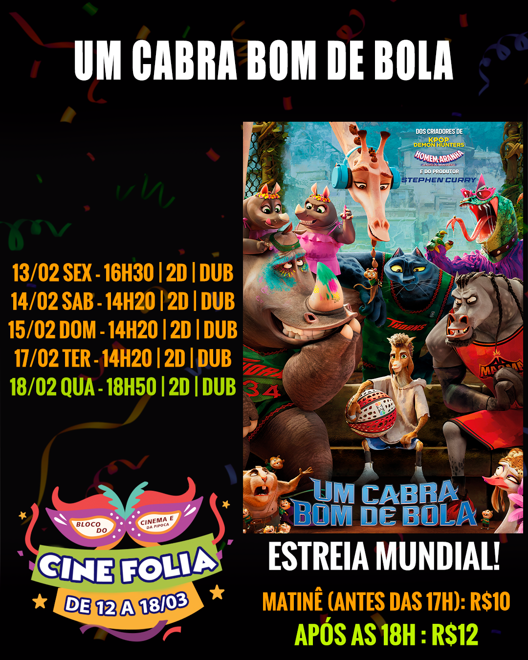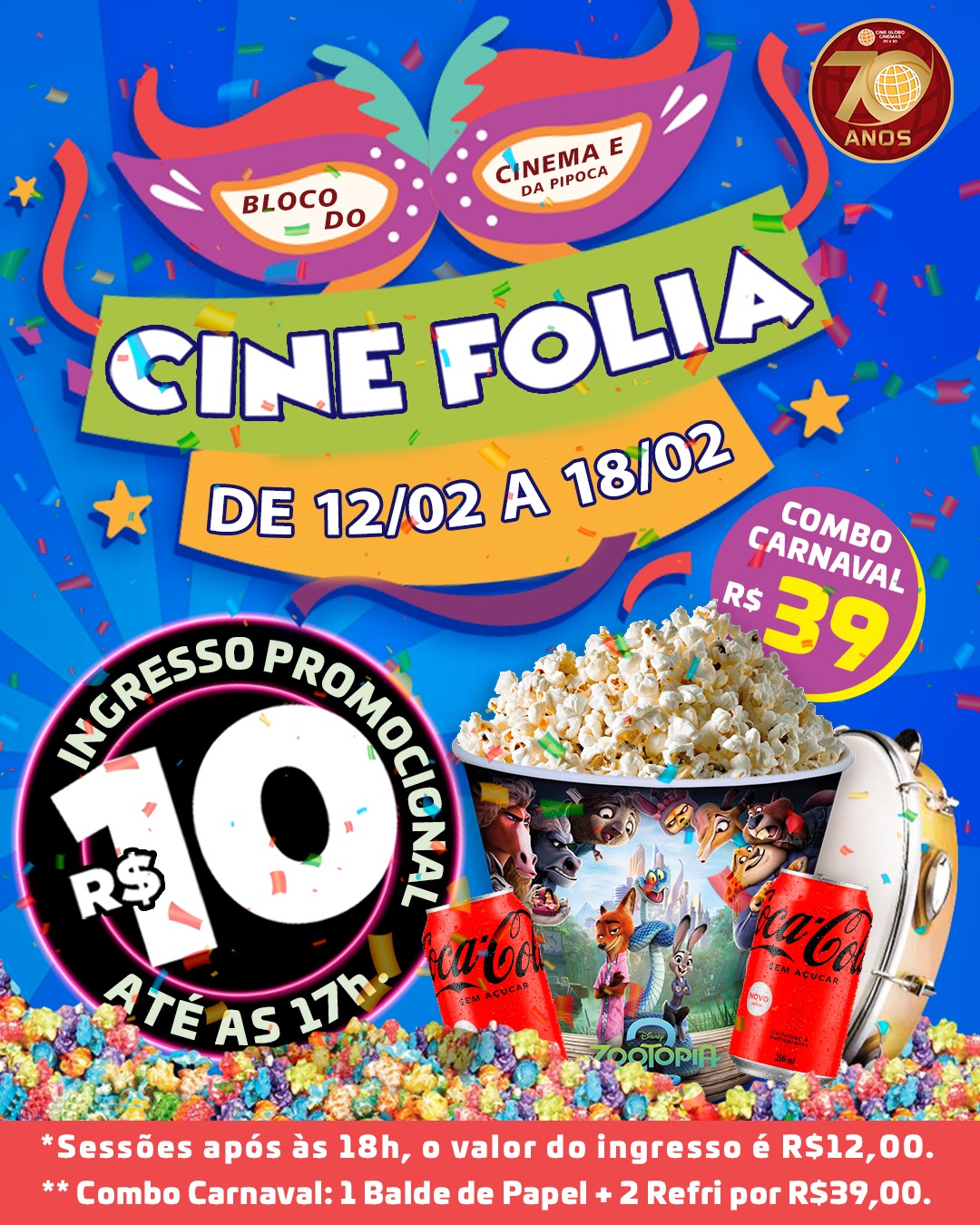 CINE FOLIA - DE 12 A 18/02 = Dando continuidade a Semana do Cinema, chegou o CINE FOLIA, a festa ficou maior e os valores promocionais ficaram os mesmos! INGRESSOS A PARTIR DE R$10,00 nas sessões até às 17h, e R$12,00 após às 18h00.