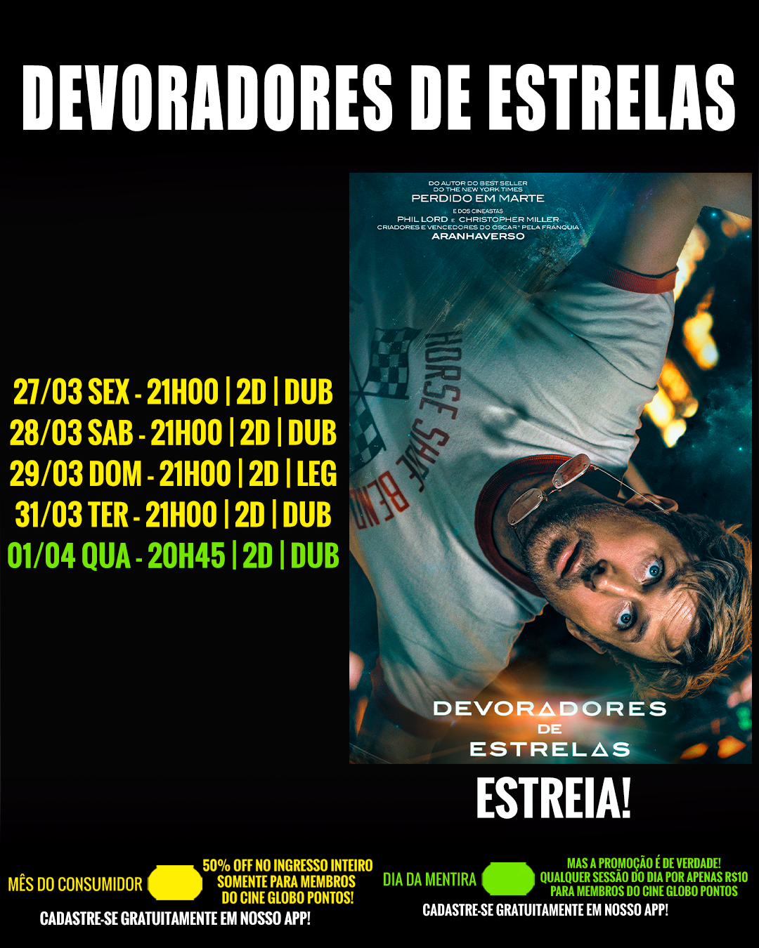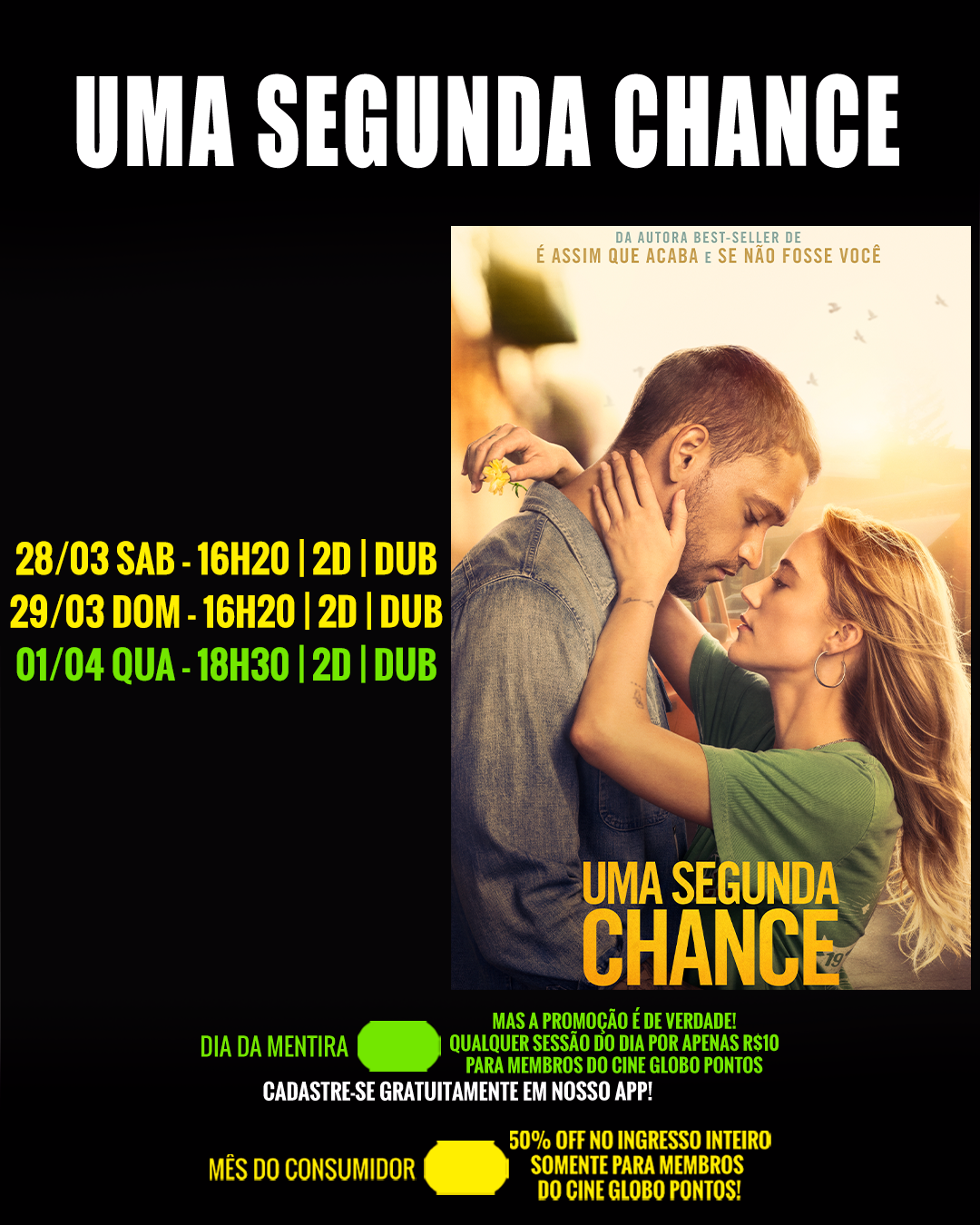 DIA 01/04 - PARECE MENTIRA, MAS É VERDADE!! SOMENTE NA QUARTA-FEIRA, DIA 01/04, TODAS AS SESSÕES COM PREÇO ÚNICO DE R$10,00 PARA MEMBROS DO CINE GLOBO PONTOS.