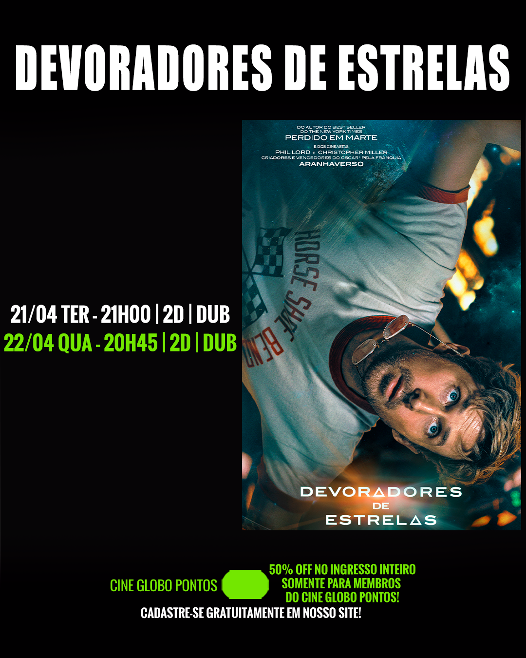 DIA 22/04 - 50% DE DESCONTO NO INGRESSO INTEIRO PARA MEMBROS DO CINE GLOBO PONTOS!