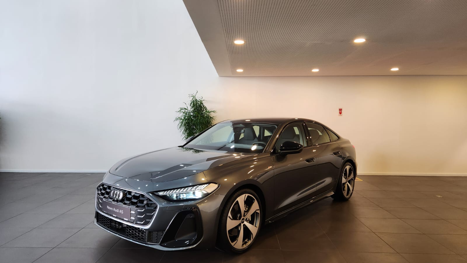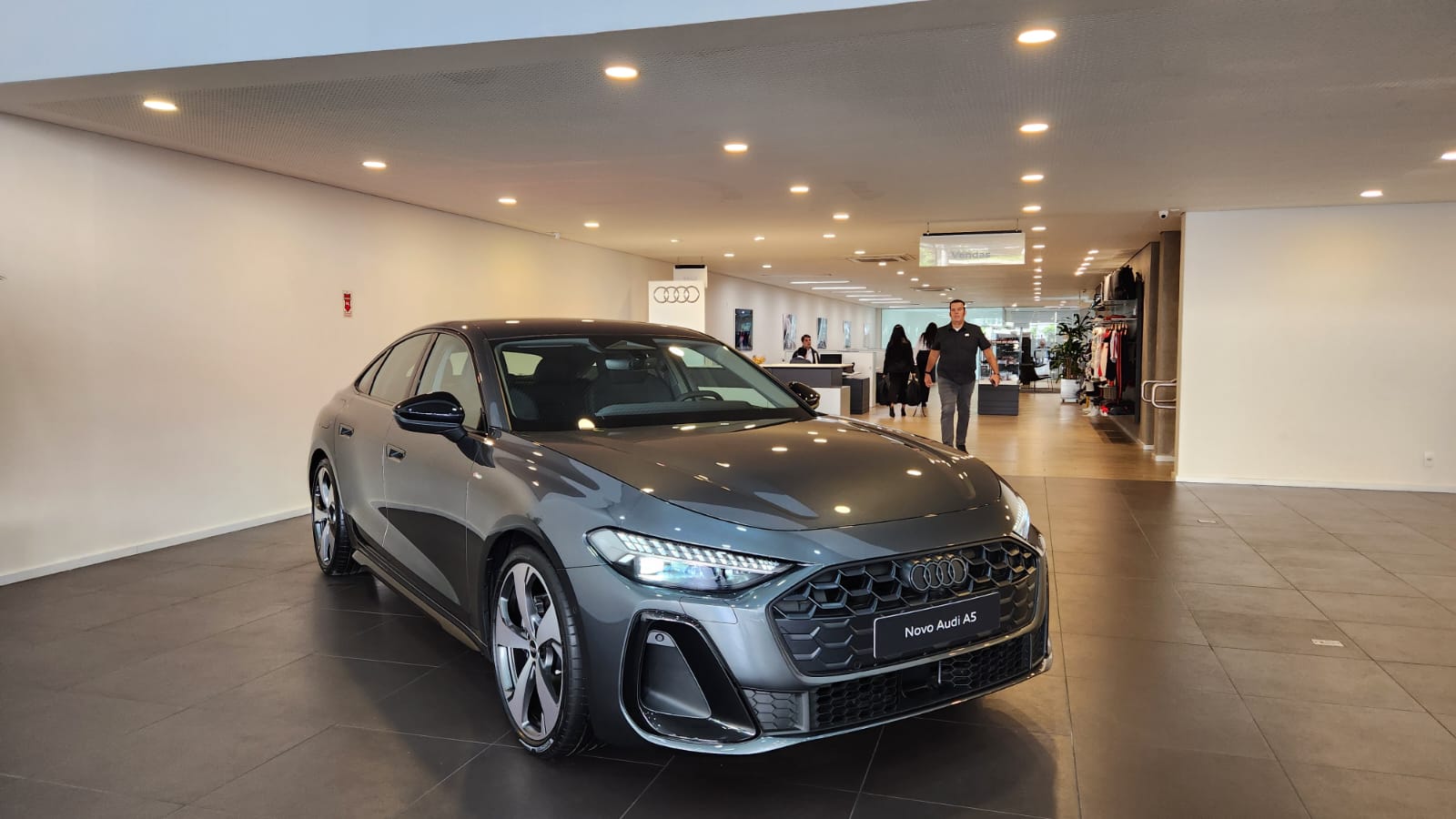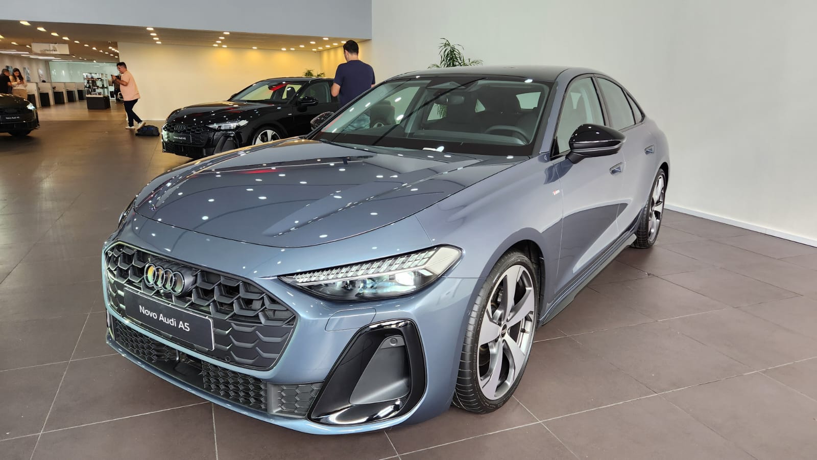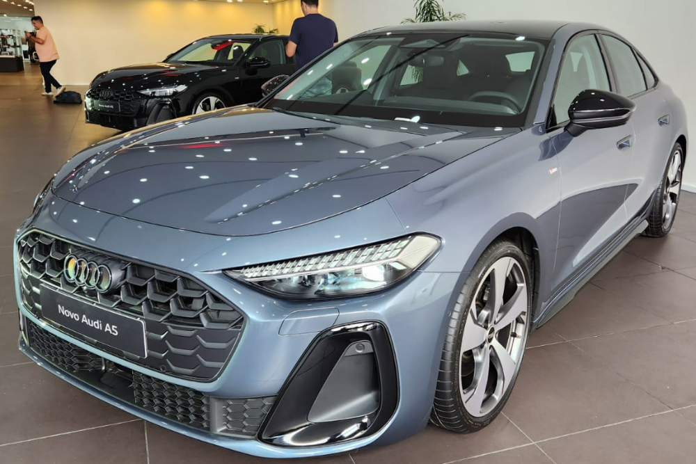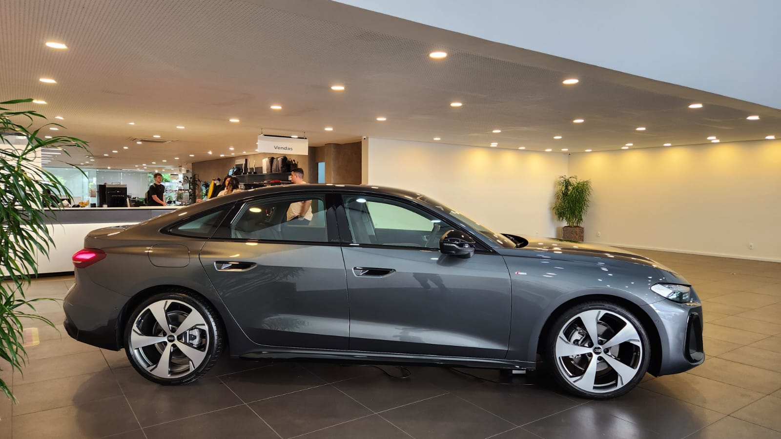Visualmente, o A5 segue a nova estética da marca: superfícies limpas, vincos suaves e perfil escultural. A dianteira possui faróis redesenhados e grade singleframe com padrão favo de mel tridimensional. As rodas Audi Sport de 20 polegadas acompanham pneus 245/35, com cinco braços Falx e acabamento em cinza acetinado fosco.
