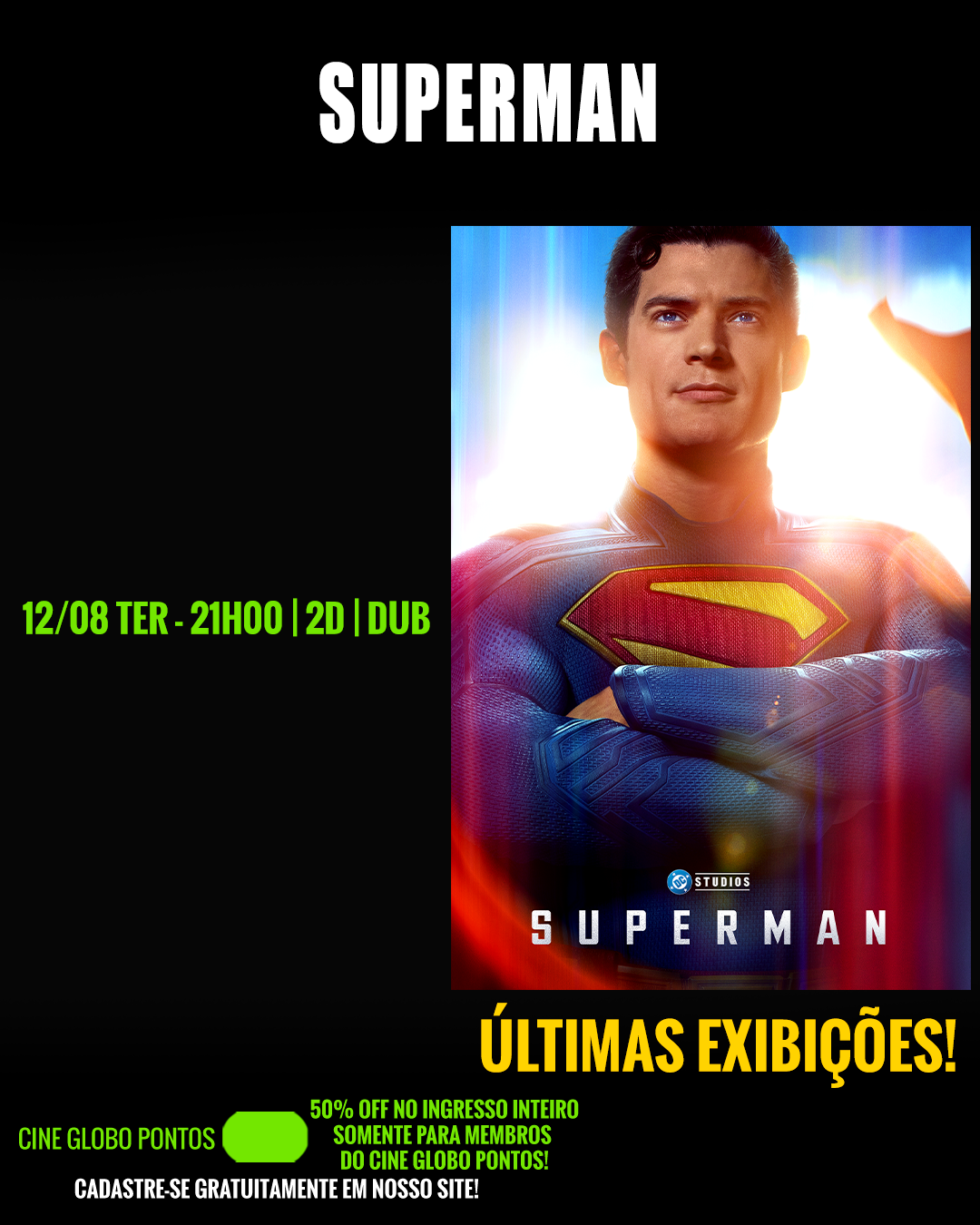 DIAS 12, 13, 19 E 20/08 - 50% DE DESCONTO NO INGRESSO INTEIRO PARA MEMBROS DO CINE GLOBO PONTOS! SE INSCREVA GRATUITAMENTE EM NOSSO APP