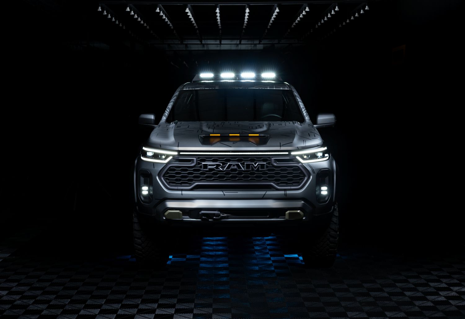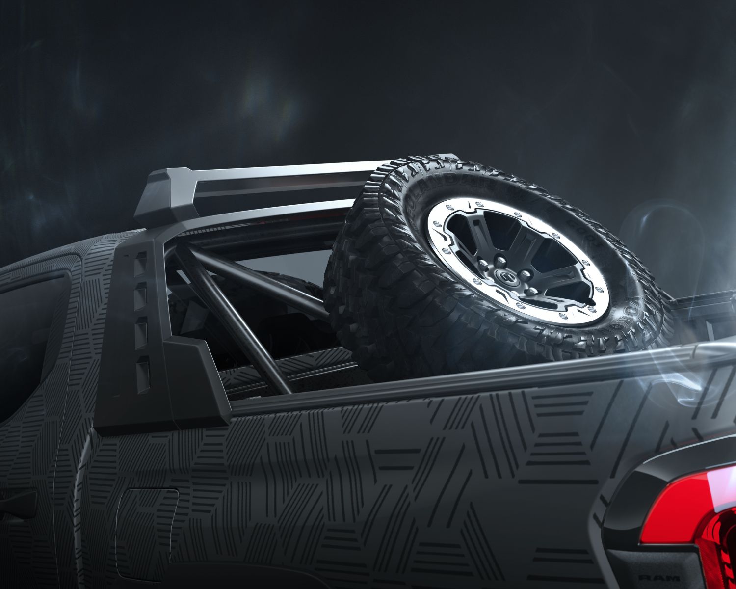 Na traseira, o destaque é o estepe aparente fixado em um Rambar exclusivo, que também abriga luzes de LED de longo alcance. Lanternas traseiras em LED, emblema Ram na tampa e para-choque com ganchos de reboque completam o conjunto. O modelo recebeu pintura especial com grafismos que simbolizam força e resistência.