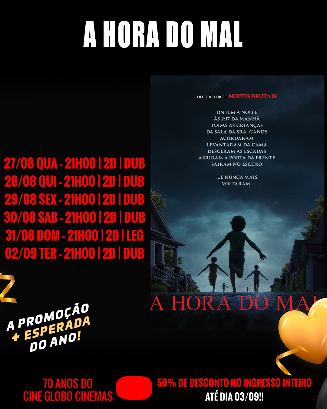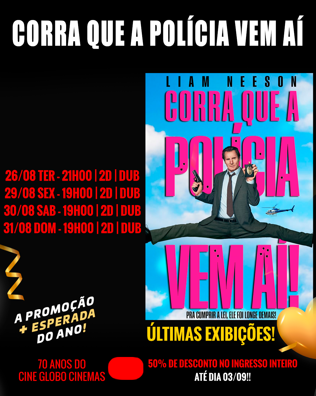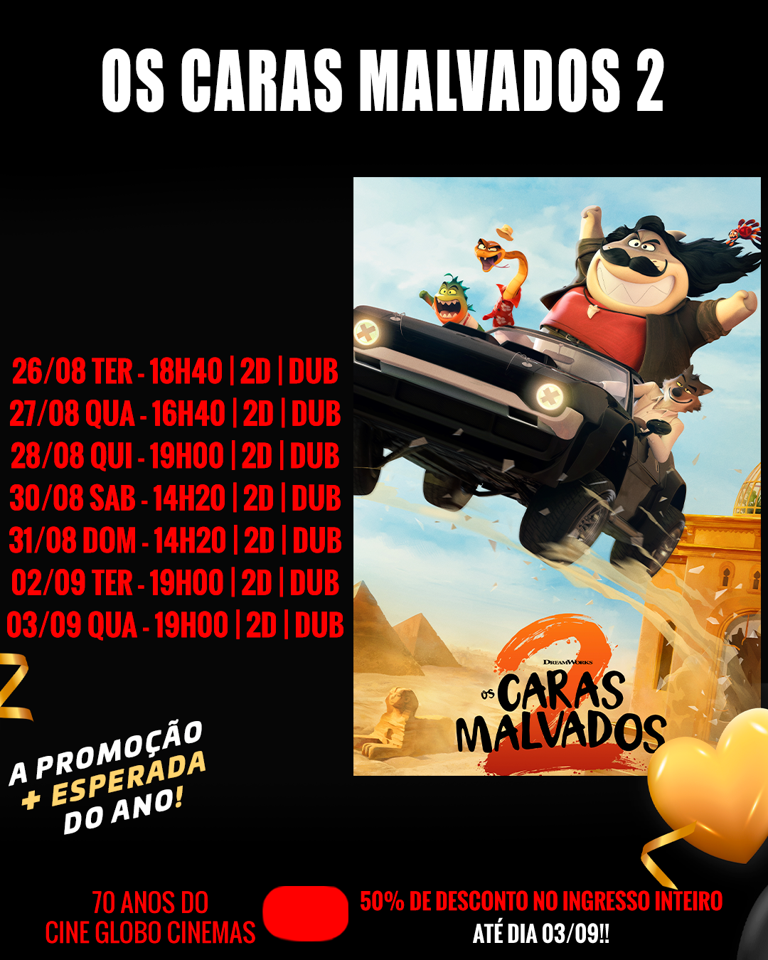 70 ANOS CINE GLOBO CINEMAS!! ATÉ DIA 03/09 TODOS OS FILMES ESTARÃO COM 50% DE DESCONTO NO INGRESSO INTEIRO!