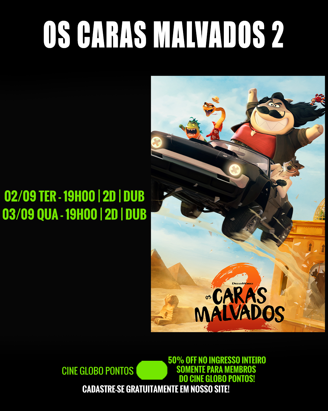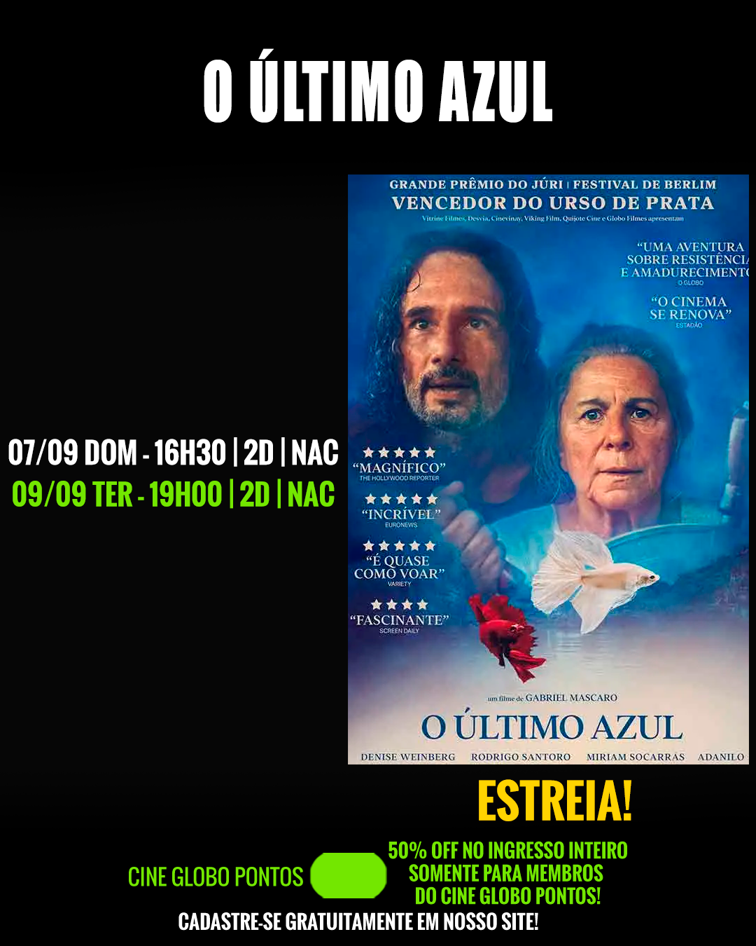 DIAS 09 E 10/09 - 50% DE DESCONTO NO INGRESSO INTEIRO PARA MEMBROS DO CINE GLOBO PONTOS! SE INSCREVA GRATUITAMENTE EM NOSSO APP