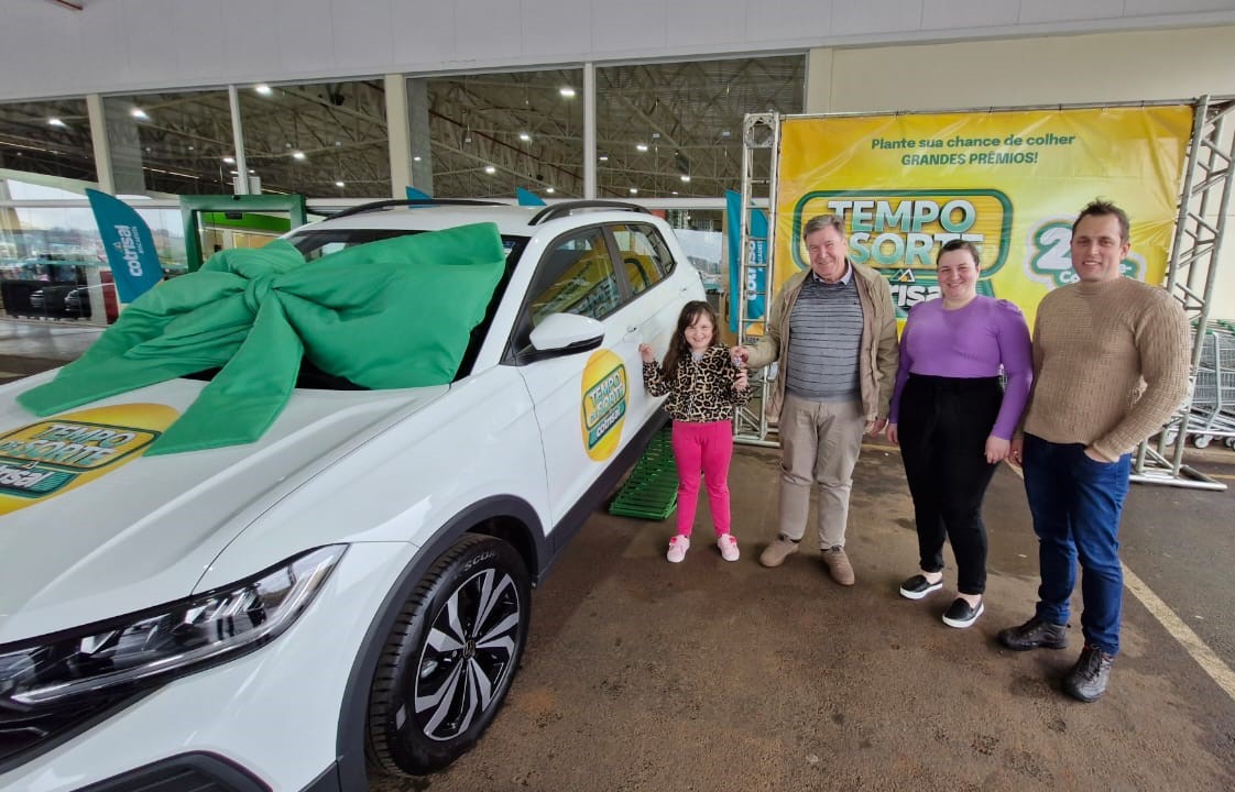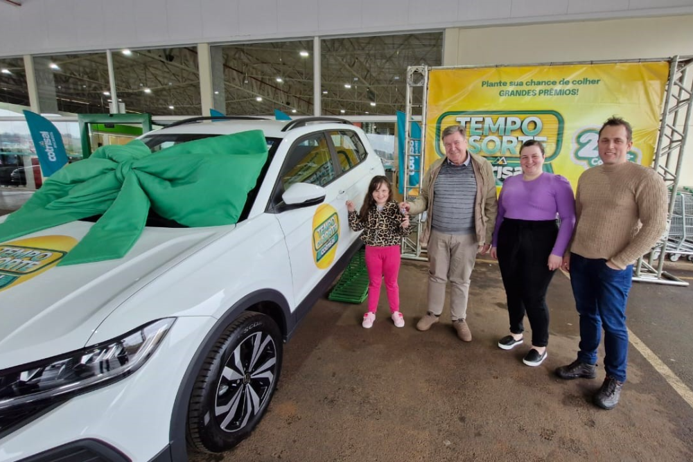 O presidente Walter Vontobel entregou a T-Cross zero quilômetro à ganhadora Heloísa Klein Colognese, que esteve acompanhada dos pais, Cristina e Daniel Colognese. Moradora do bairro Vicentinos, a família é cliente do Cotrisal Atacadista e relatou que os cupons das compras realizadas no local garantiram a participação no sorteio que resultou no prêmio.