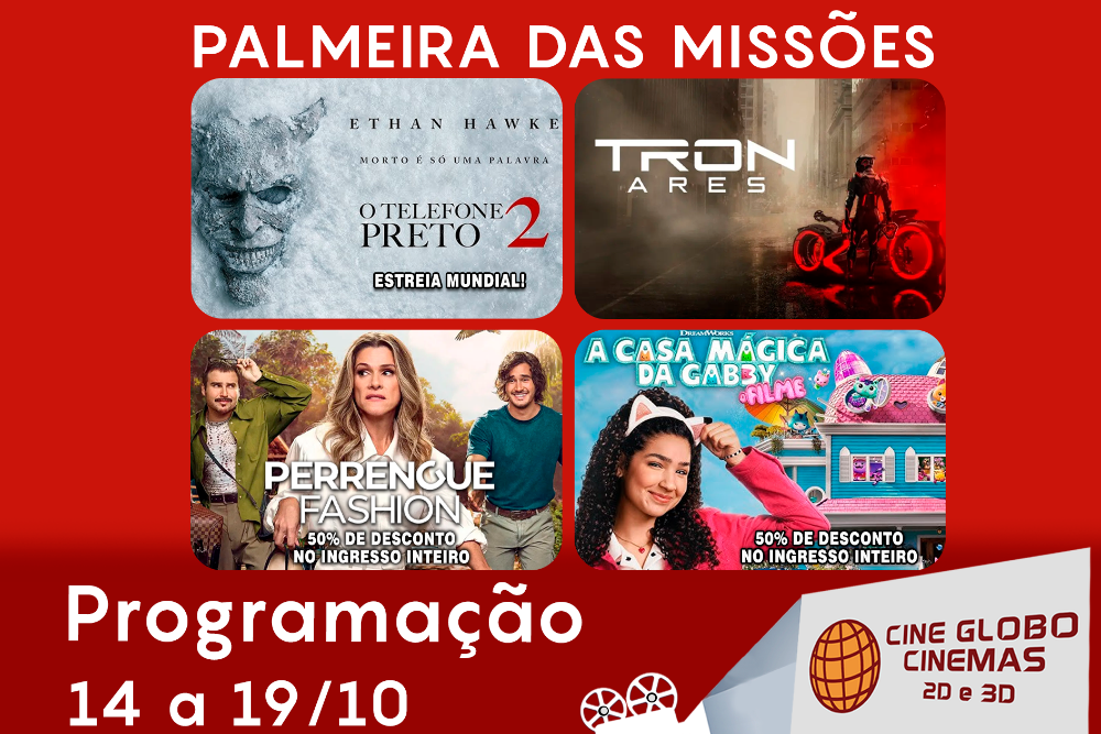 Programação de 14 a 19/10 do Cine Globo Cinemas de Palmeira das Missões