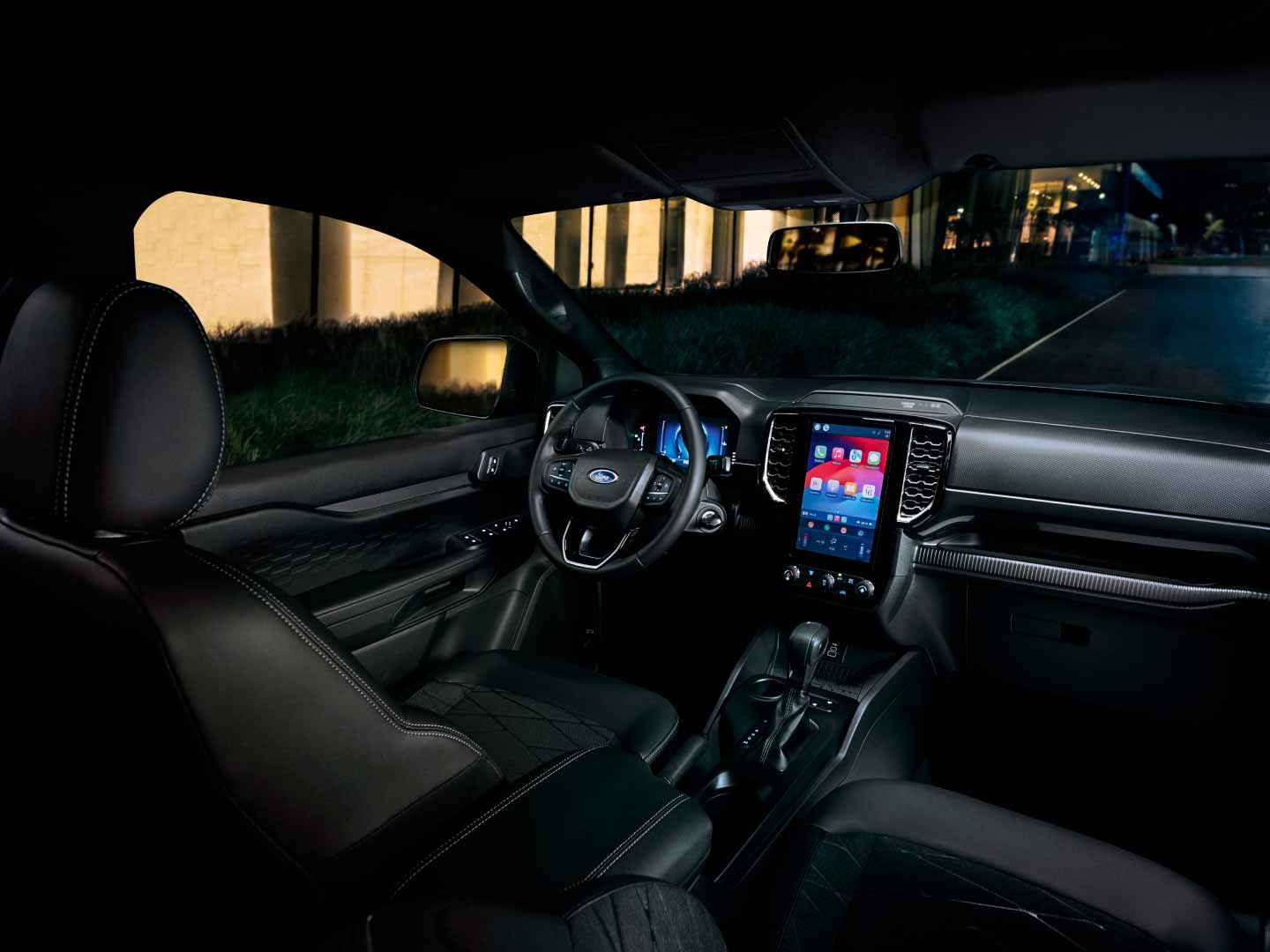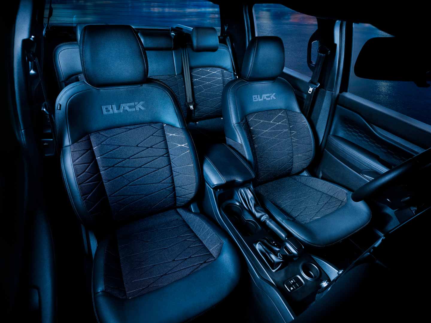 No interior, a Ranger Black apresenta um ambiente de acabamento escurecido, com bancos parcialmente em couro, detalhes em Black Piano e o emblema da versão gravado nos encostos. A ergonomia e a disposição dos comandos favorecem o uso cotidiano, e o painel digital de 8 polegadas, aliado à central multimídia Sync 4 com tela de 10 polegadas, oferece interface intuitiva e conectividade sem fio com Android Auto e Apple CarPlay. O sistema FordPass Connect permite ainda controle remoto de funções do veículo e monitoramento em tempo real, ampliando a integração entre motorista e picape.