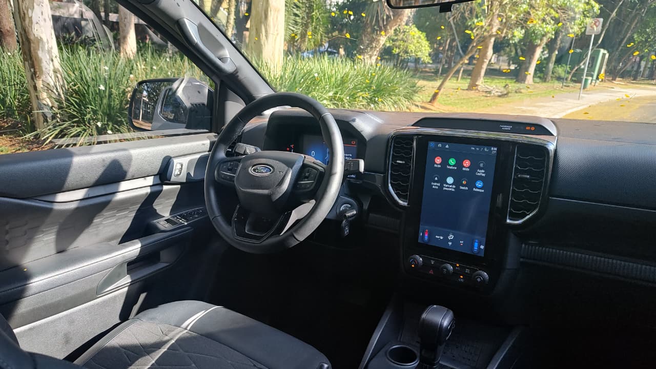 Durante a avaliação, percorri trajetos urbanos e rodoviários, além de pequenos trechos off-road, para compreender o comportamento da picape em diferentes contextos. No uso urbano, onde o porte de 5,37 metros de comprimento e 3,27 metros de entre-eixos exige atenção no trânsito e nas manobras, a Ranger Black se mostrou eficiente graças à suavidade do câmbio automático e ao bom acerto da direção elétrica. Mesmo em ambientes de tráfego intenso, o conforto a bordo é notável, com posição elevada de condução e boa visibilidade, o que facilita o uso diário.