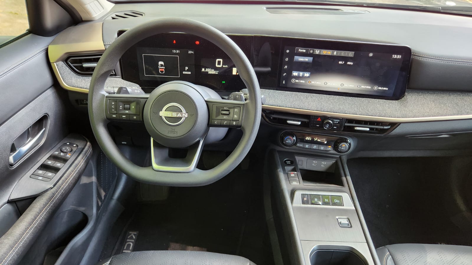 O Kicks 2026 também foi redesenhado internamente. A nova central multimídia de 12,3 polegadas integrada ao painel digital forma um conjunto único e moderno. O seletor de marchas eletrônico e-Shifter substitui a alavanca tradicional e libera espaço no console central. O pacote de segurança foi ampliado para 23 recursos eletrônicos, incluindo alerta de colisão, frenagem automática de emergência, sistema de visão 360° e alerta de objetos esquecidos no banco traseiro.