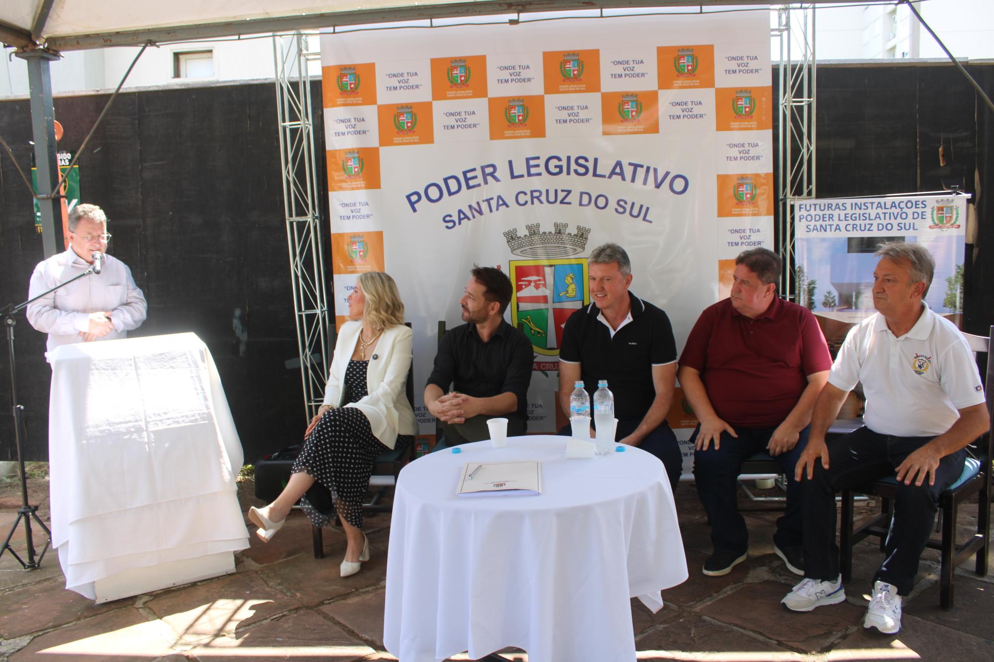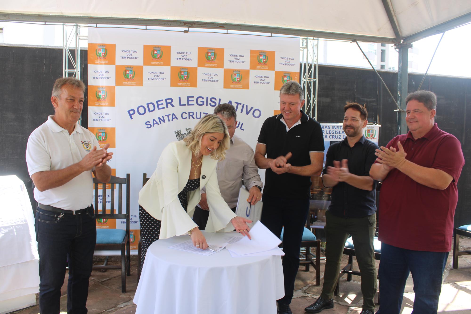 O ato de assinatura foi realizado na calçada do terreno do futuro prédio, com a presença dos representantes da empresa, de vereadores e funcionários da Câmara. A presidente Nicole disse que trata-se de um momento histórico para o município, pois é mais um passo para a construção da sede própria do Legislativo.