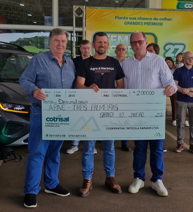 Mantendo uma tradição que reforça o compromisso social da cooperativa, a Cotrisal também destinou R$ 2 mil à APAE de Três Palmeiras. O vice-presidente da entidade, Fábio Cesar Grando, recebeu o cheque simbólico.
