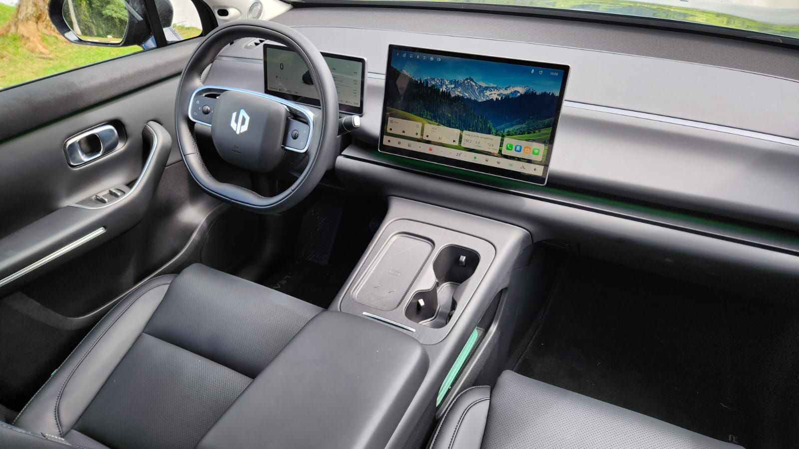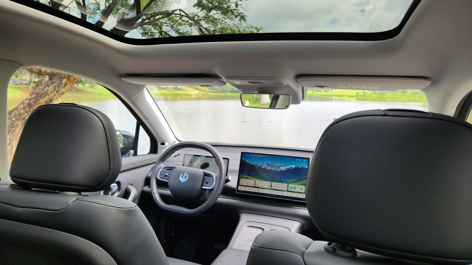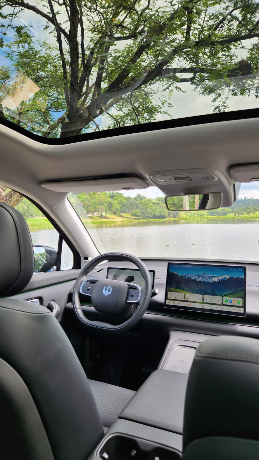 O interior concentra comandos na central multimídia Leap One de 14,6 polegadas, que integra navegação, climatização e ajustes do veículo. O painel digital de 10,25 polegadas complementa as informações de condução. Durante a avaliação, utilizei a chave digital integrada ao smartphone e o sistema Leap+ Connect para monitoramento remoto. O teto panorâmico de 2,1 m² e o banco do motorista com função de boas-vindas fazem parte do pacote único.