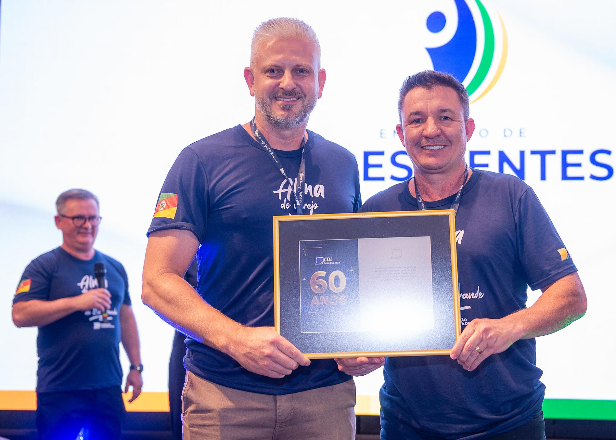 Bento Gonçalves – O presidente da CDL Santa Cruz, Gilberto Eidt, recebeu uma placa em homenagem aos 60 anos da entidade – a ser completada em julho deste ano - durante o Encontro de Presidentes da Federação Varejista do Rio Grande do Sul, realizado em Bento Gonçalves, no final de semana. E entrega foi realizada pelo diretor de Crescimento, Expansão e Distritais, Ricardo Fernando Bartz, junto com os demais membros da diretoria.