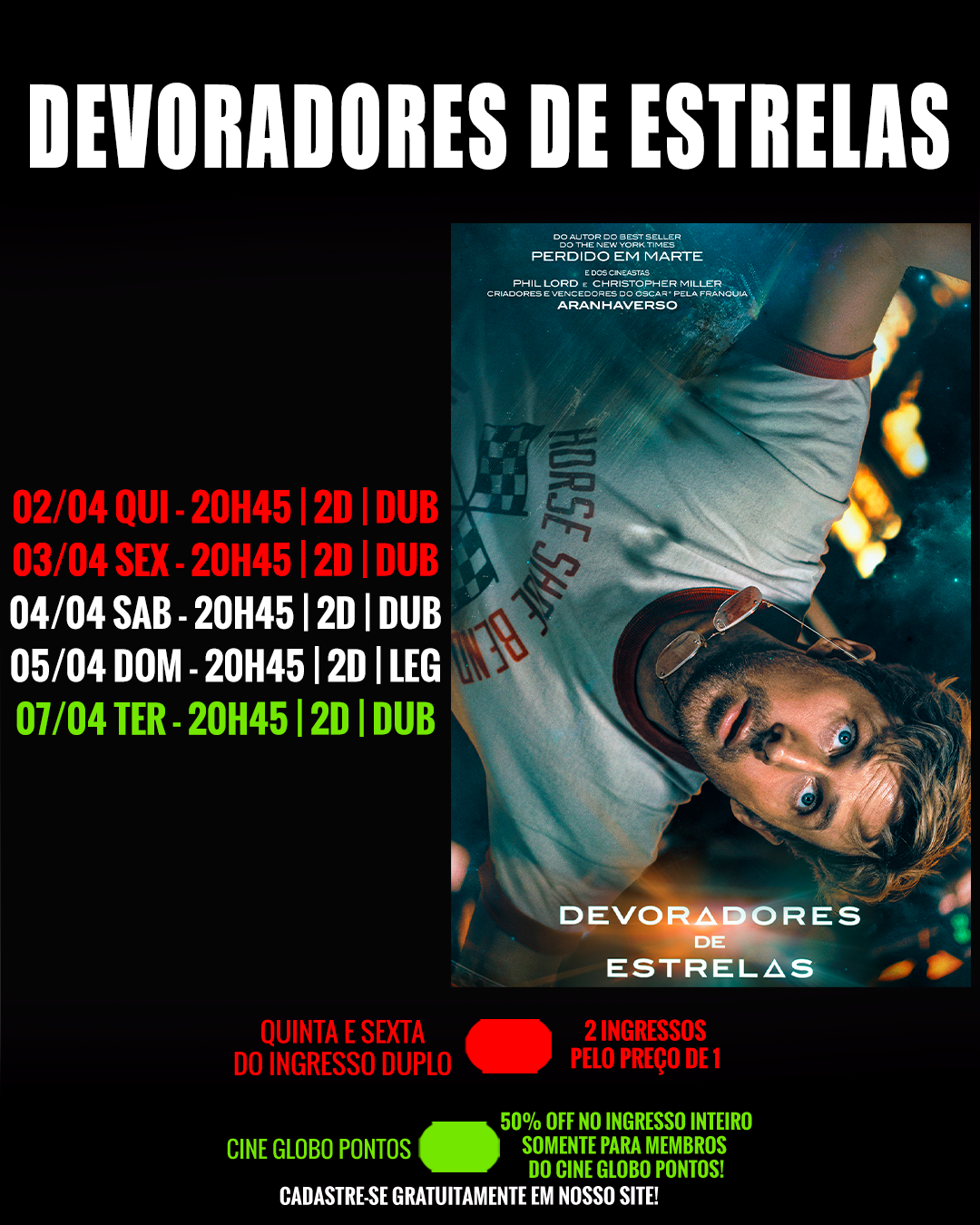 DIAS 07 E 08/04 - 50% DE DESCONTO NO INGRESSO INTEIRO PARA MEMBROS DO CINE GLOBO PONTOS!