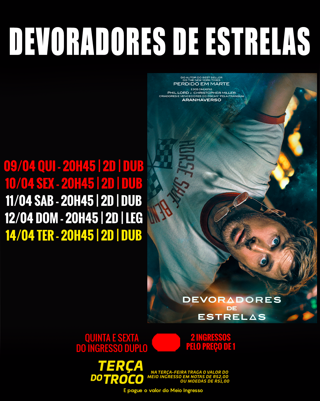 DIA 14/04 - TERÇA DO TROCO! TRAGA O VALOR DO MEIO INGRESSO EM NOTAS DE R$2,00 OU MOEDAS DE R$1,00 E R$0,50 E PAGUE APENAS MEIO INGRESSO!