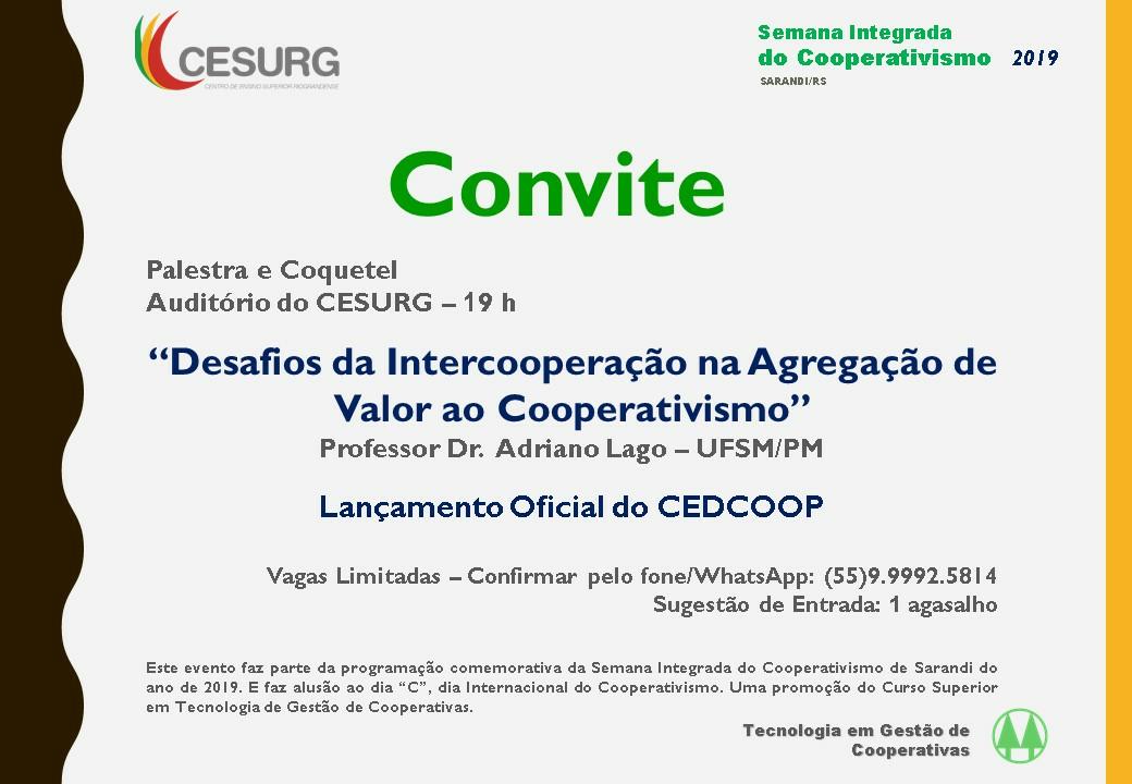 Para a mesma noite, será feito o lançamento oficial do CEDCOOP – Centro de Estudos e Desenvolvimento do Cooperativismo. A noite é uma organização do Curso Superior em Tecnologia de Gestão de Cooperativas.