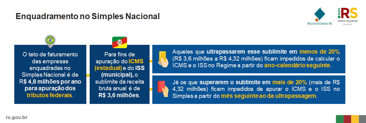 O limite para enquadramento das empresas no Simples Nacional, regime tributário diferenciado, simplificado e favorecido aplicável às Microempresas e Empresas de Pequeno Porte, fixa o teto de faturamento das empresas em R$ 4,8 milhões. Entretanto, conforme alerta a Receita Estadual do Rio Grande do Sul, esse limite somente é válido para a apuração dos tributos federais. Para fins de apuração do ICMS (estadual) e do ISS (municipal), o limite se mantém em