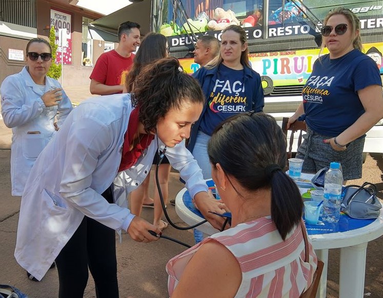 Durante o evento, houve prática de exercícios físicos e brinquedos infláveis para a diversão das crianças. Professores e estudantes do curso Técnico em Enfermagem e Educação Física do Cesurg prestaram orientações em saúde, com a aferição de pressão arterial e demonstração de primeiros socorros.