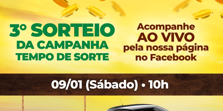A Cotrisal realizará neste sábado, 09 de janeiro, o 3º Sorteio da “Promoção Tempo de Sorte Cotrisal – 2020”, a partir das 10 horas, que em virtude da pandemia não reunirá público, será transmitido ao vivo pelo Facebook da Cotrisal.