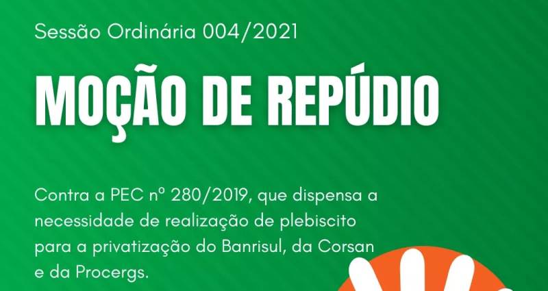 Os parlamentares aprovaram, na última Sessão Ordinária, uma Moção de Repúdio à PEC nº 280/2019, que revoga os §§ 2 e 5º do art. 22 da Constituição do Estado do Rio Grande do Sul, dispensando a necessidade realização de plebiscito para alienação ou transferência do controle acionário, bem como a extinção, fusão, incorporação ou cisão do e Banco do Estado do Rio Grande do Sul S.A. (Banrisul), da Companhia Riograndense de Saneamento (Corsan) e da Companhia de Processamento de Dados do Estado do Rio Grande do Sul (Procergs).