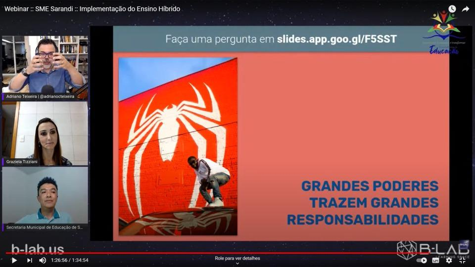 A Prefeitura de Sarandi, através da Secretaria de Educação e em parceria com a B-LAB Learning Space está promovendo a capacitação de professores através de um Webinário ao longo do primeiro semestre de 2021. Neste período, os temas são voltados para reflexões acerca da implementação do Ensino Híbrido nas escolas da rede Municipal de Ensino.