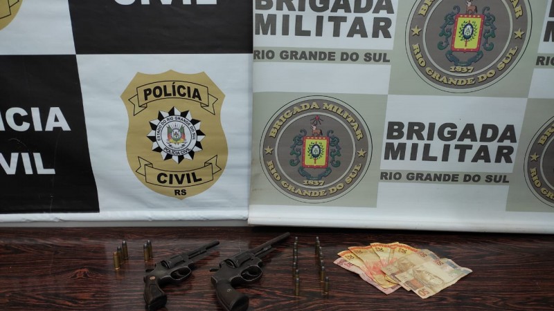 A prisão ocorreu às margens da RS 317, após abordagem de um veículo. Dois homens e uma mulher ocupavam o veículo, sendo apreendido um revólver calibre 32 e outro calibre 38, municiados e mais 8 munições sobressalentes