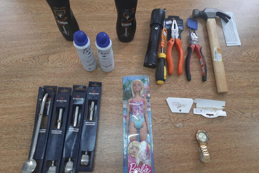 *Os objetos apreendidos foram*: 01 relógio dourado marca Condor; 01 preta marca Song Star; 01 martelo; 01 chave de fenda; 01 alicate de corte; 01 alicate; 02 correntes douradas semi jóia; 02 desodorantes da marca Dove; 02 condicionadores de cabelo marca Monange; 04 bombas de chimarrão prateada marca Ditreviso Inox; 01 boneca da Barbie.